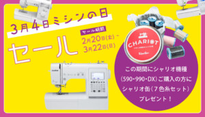 ミシンの日を記念いたしまして、シャリオ機種(Chariot590・990・DX)をご購入のお客様へミシン糸が7色入ったシャリオ缶をプレゼントいたします。期間限定のオリジナル缶(非売品)となっております。